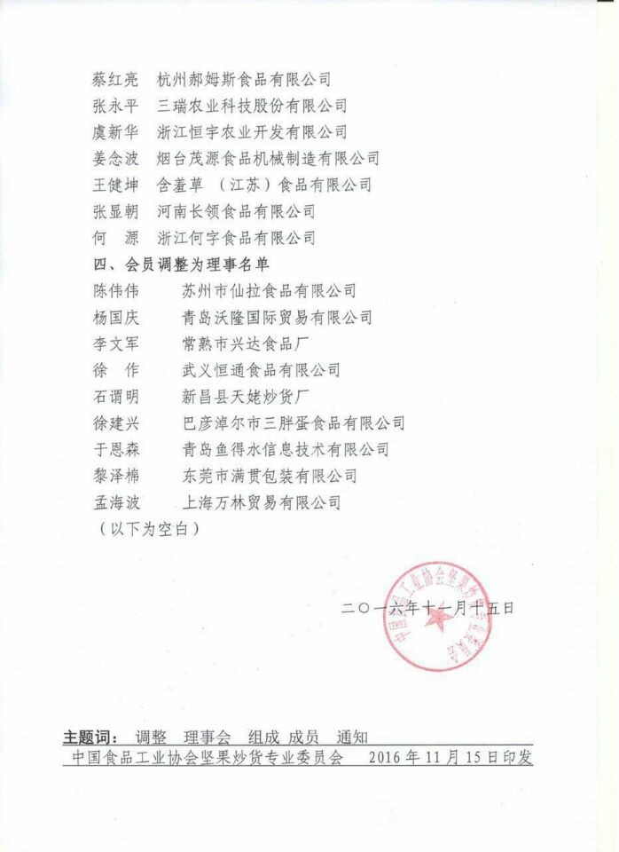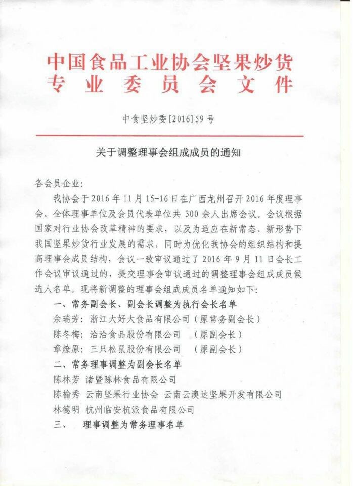 2016年11月15-16日,中國堅果協(xié)會年度理事會召開,中國堅果炒貨行業(yè)新的核心團隊誕生,全行業(yè)持續(xù)健康發(fā)展。我司總經(jīng)理姜念波當選新一屆理事會常務理事。
