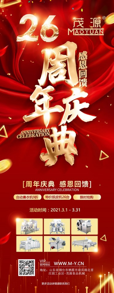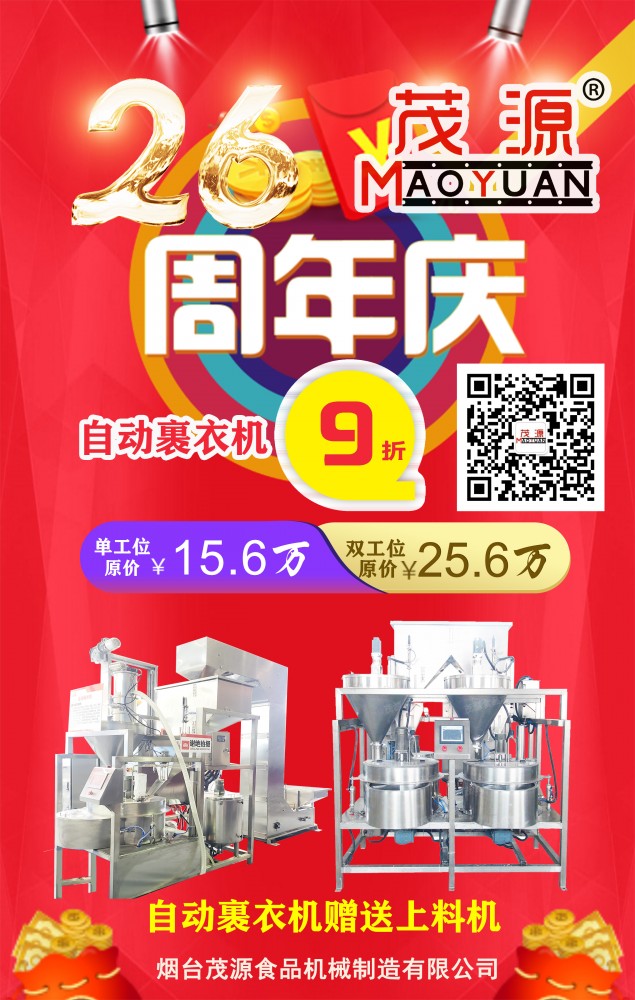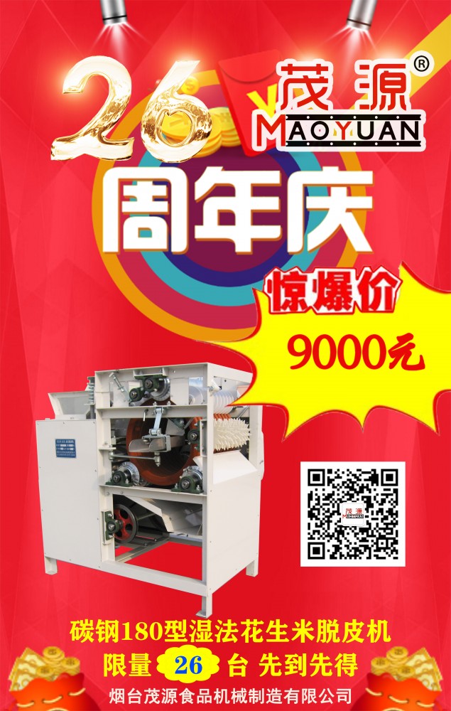 煙臺(tái)茂源食品機(jī)械即將迎來(lái)26周年慶,為感謝新老客戶長(zhǎng)期以來(lái)的支持與信任,現(xiàn)特推出以下感恩回饋活動(dòng):?jiǎn)喂の?、雙工位自動(dòng)裹衣機(jī)原價(jià)15.6萬(wàn)元、25.6萬(wàn)元基礎(chǔ)上降價(jià)10%,并隨機(jī)贈(zèng)上料機(jī);碳鋼180型濕法花生米脫皮機(jī)特價(jià)9000元,限量26臺(tái),先到先得!