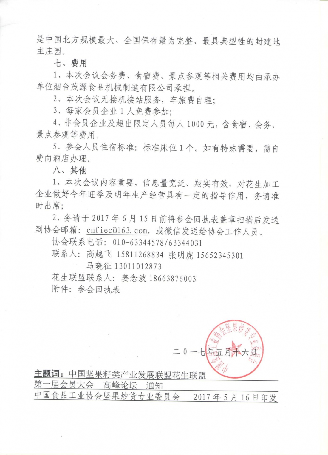 2017年7月4日—6日,由中國食品工業(yè)協(xié)會堅果炒貨委員會主辦,中國堅果籽類產(chǎn)業(yè)發(fā)展聯(lián)盟花生聯(lián)盟和煙臺茂源食品機械制造有限公司共同承辦的中國堅果籽類產(chǎn)業(yè)發(fā)展聯(lián)盟花生聯(lián)盟頭一屆會員大會暨高峰論壇在山東省棲霞市召開。